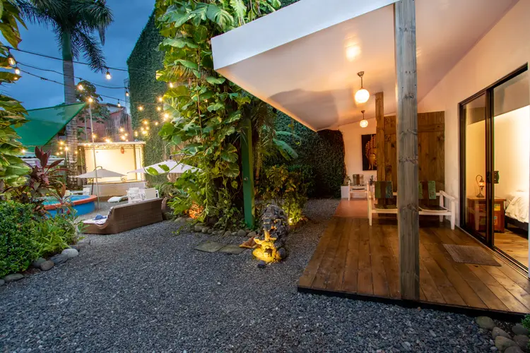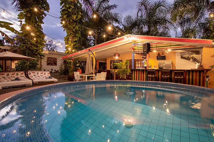 Lush gardens, a stage for live music, and a jacuzzi-style pool. Fully equipped kitchen, high-speed Wi-Fi, laundry facilities, private pool, steel gate, and